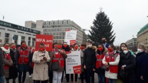 Die Übergabe eines Protestbriefes an das Bundesministerium für Gesundheit im Anschluss an die Demo am Brandenburger Tor konnte nur an der Pforte erfolgen. Der Verband medizinischer Fachberufe fordert unter anderem einen Coronasonderbonus aus staatlichen Mitteln – wie für Pflegekräfte in Kliniken, eine größere Tarifverbindlichkeit und eine zeitnahe Gegenfinanzierung der Tarifsteigerungen ein.