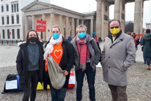 Emmi Zeulner und Sepp Müller sind zur Demo am Brandenburger Tor gekommen. Beide Mitglieder des Deutschen Bundestags gehören der CDU/CSU-Fraktion an. „Schauen wir mal, was die Opposition jetzt für uns tun kann“, sagt Hannelore König und erklärt, was den Medizinischen Fachangestellten wichtig ist. „MFAs brauchen momentan Luft zum Atmen.“ Das beträfe die zweifellos notwendige Digitalisierung, aber auch politische Entscheidungen, die in ambulanten Praxen des Landes „ausgebadet“ werden müssten. Als Beispiel nennt sie die Impfpflicht für Gesundheitsberufe ab März 2022. Die Mehrheit der Teilnehmenden ist „natürlich gegen Corona geimpft“, aber eine Stigmatisierung müsse unterbleiben, wenn man nicht noch mehr Beschäftigte aus dem Beruf drängen wolle. Abgesehen davon, dass man mit Motivieren und Überzeugen erfolgreicher sei, müsse es, wenn überhaupt, eine Impfpflicht für alle geben. Die Umstehenden applaudieren.
