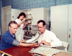 Schwester Angelika war mit ihren Kolleginnen für spezielle Vorsorgeuntersuchungen, regelmäßige Betriebsbegehungen, Entnahme von Essensproben, Hygiene und Prävention zuständig. Zudem verabreichte sie verordnete Medikamente, gab Spritzen, legte Verbände an und führte EKG’s, Hörtests oder Ohrspülungen durch. Nicht zu vergessen die Desinfektion und Sterilisation der damals gebräuchlichen Glasspritzen und anderer medizinischer Utensilien.